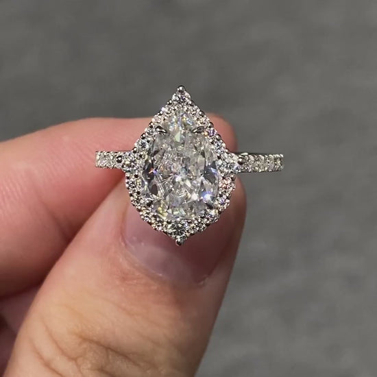 Amara captures the very essence of romance and refinement in a single masterpiece. At its centre, a breathtaking 3-carat pear-cut moissanite (11 × 7.5 mm) finished in a crushed-ice style dazzles with every turn of the hand. A halo of pavé-set moissanites dances around the main gem, amplifying its brilliance and lending the design an air of timeless glamour. The slender prong-set band offers a delicate counterpoint, ensuring the pear-shape remains the star of the show.