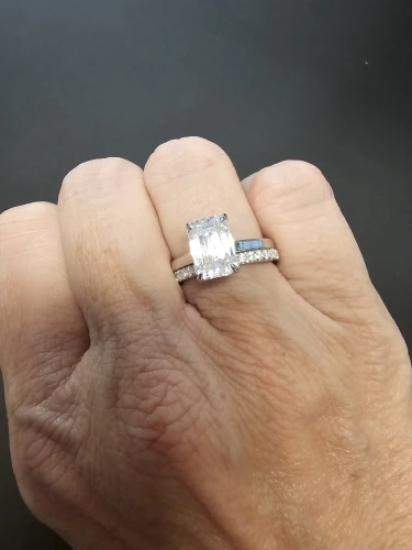 Completing the ensemble is a perfectly matched wedding band set with fifty-six 0.8 mm round moissanites, forming a continuous ribbon of sparkle that harmonises effortlessly with the engagement ring. Worn together, these two pieces strike the ideal balance between statement-making and refined elegance, symbolising both unity and individual expression.