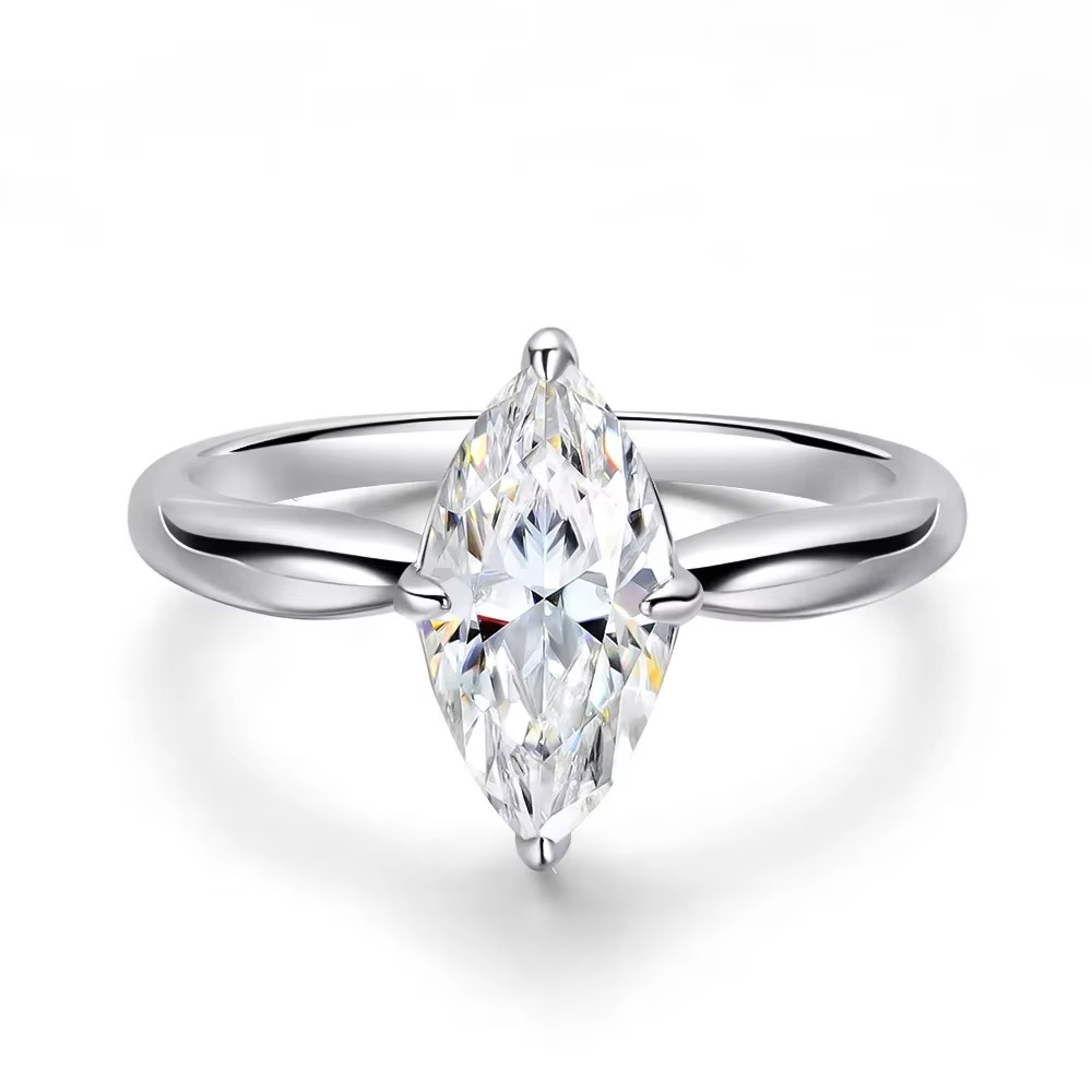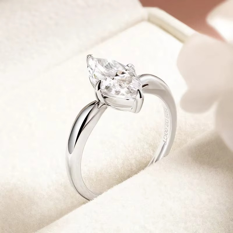 Solene is a celebration of bold elegance and refined craftsmanship. Designed to captivate from every angle, this striking ring features a radiant 3-carat marquise-cut moissanite as its centrepiece. The elongated silhouette of the marquise cut creates a flattering, lengthened look on the finger while maximising brilliance and fire with every movement.