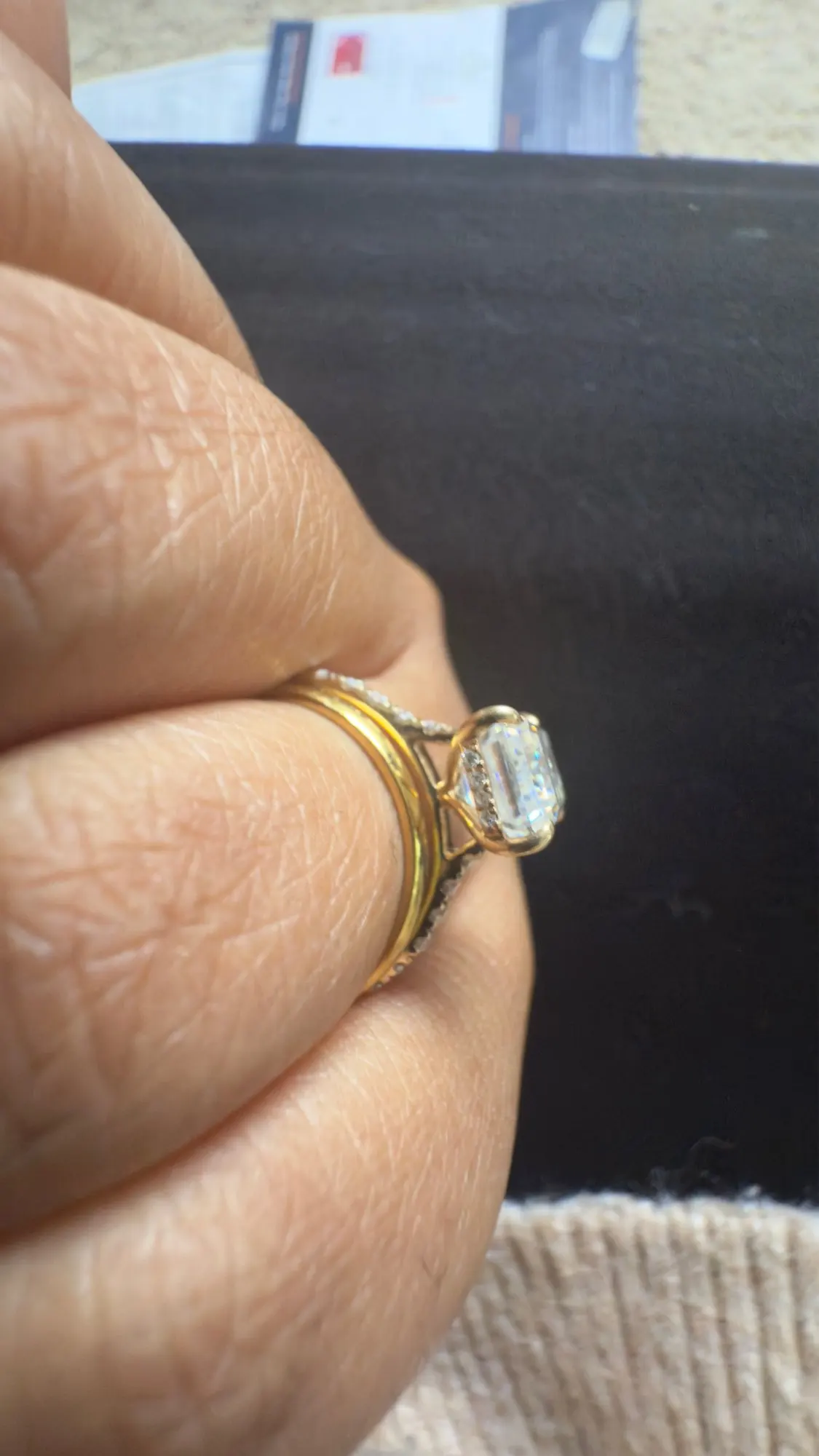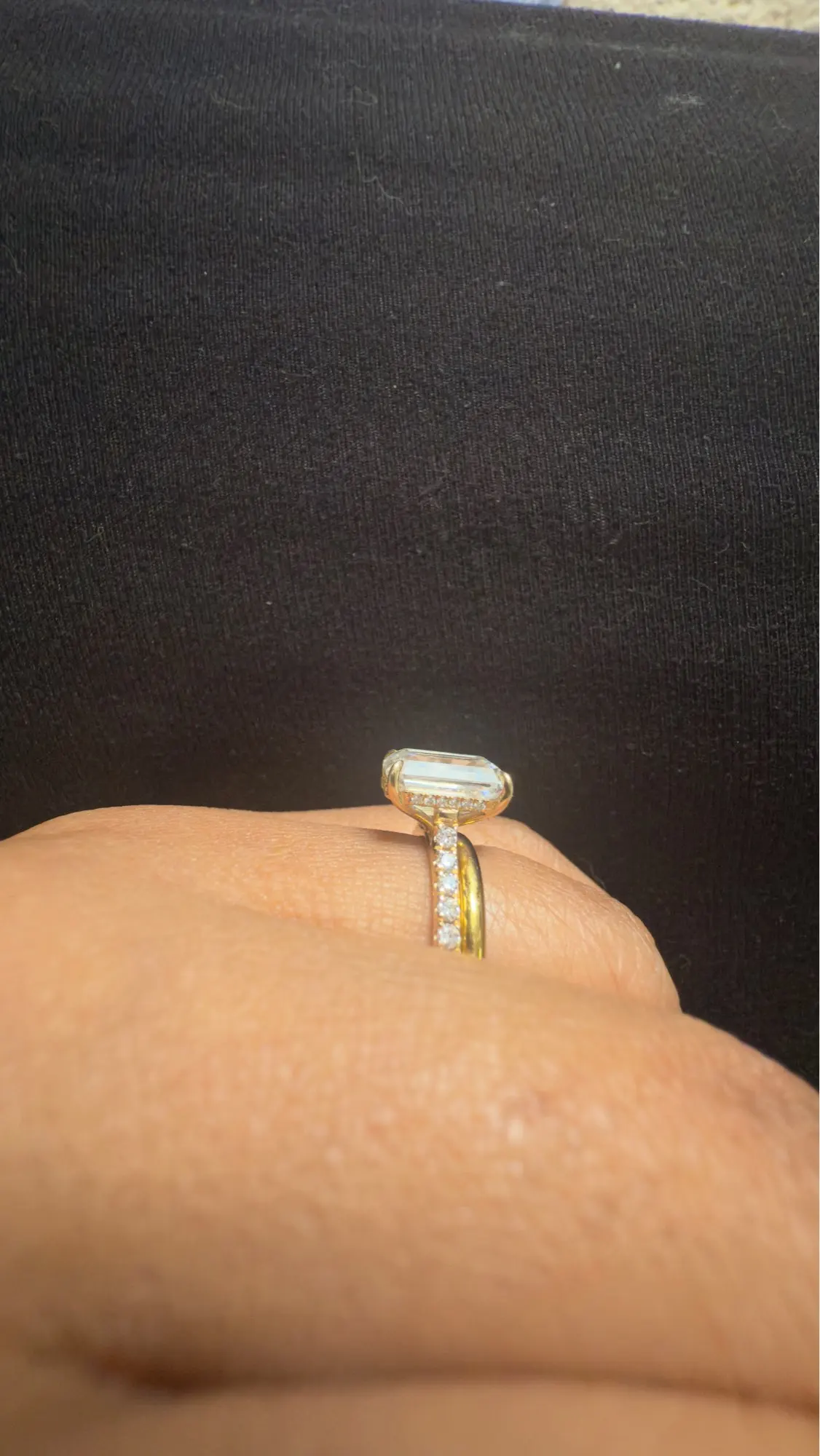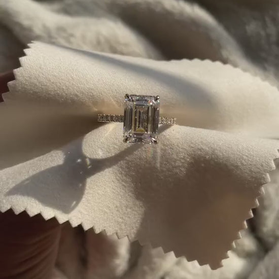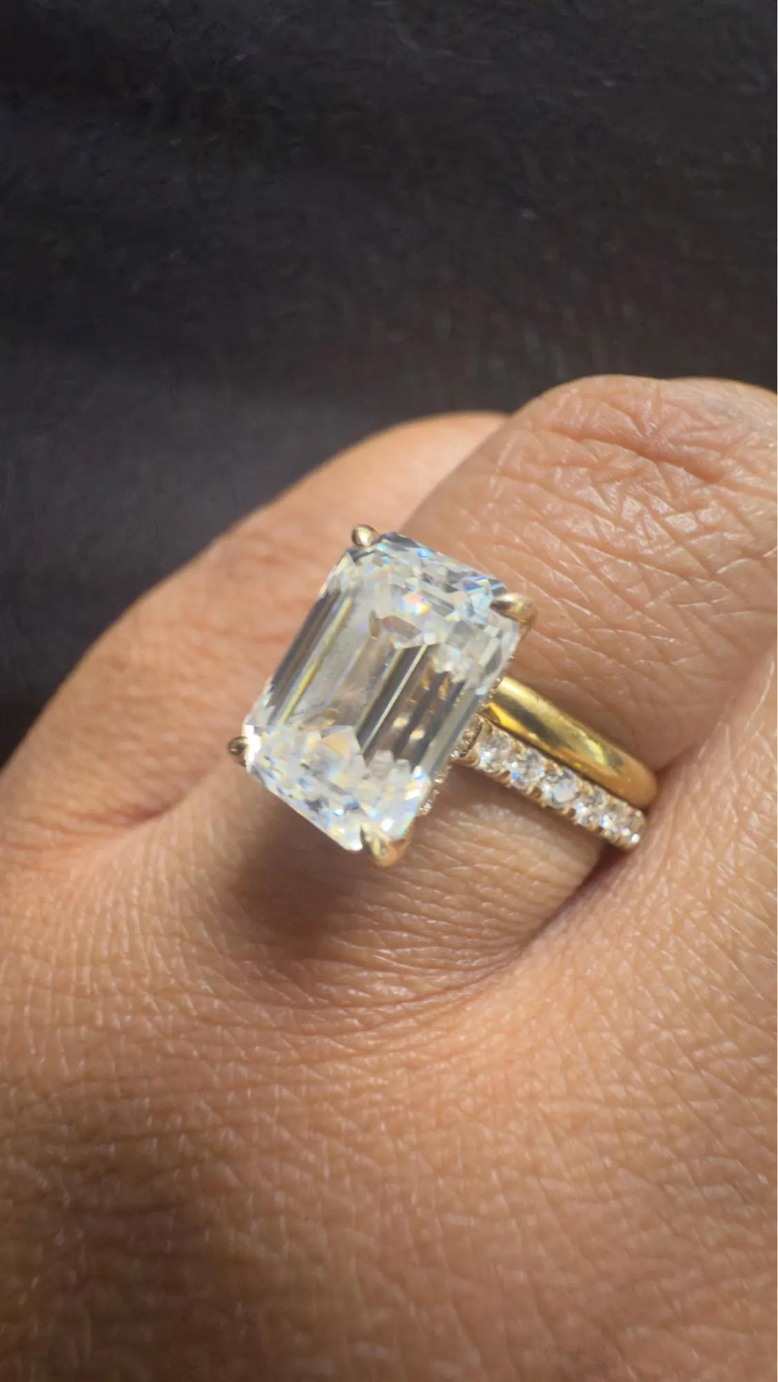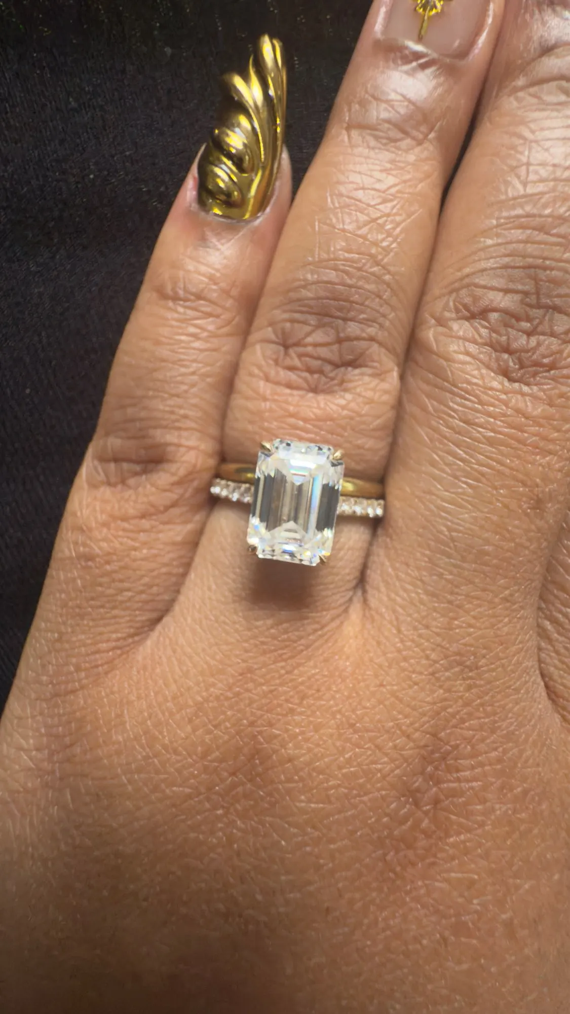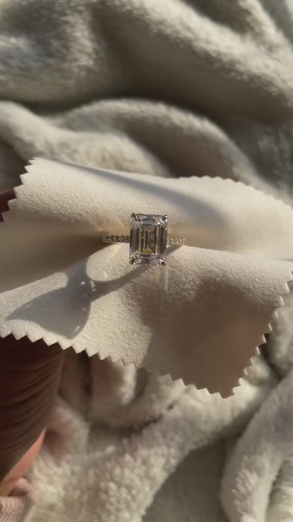 The Sorella Ring is the very essence of timeless beauty and refined sophistication. At its centre, a commanding 4-carat emerald-cut moissanite (7.5 × 10.5 mm) in D colour and VVS1 clarity captures the eye with its crisp step-cut facets and exceptional brilliance. Sleek prongs hold this stunning gem aloft, while a delicate halo of round moissanite side stones—measuring 0.9 mm and 1.8 mm—adds a whisper of radiance that dances with every movement. The band, thoughtfully contoured for comfort, balances luxurious presence with effortless wearability.