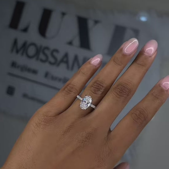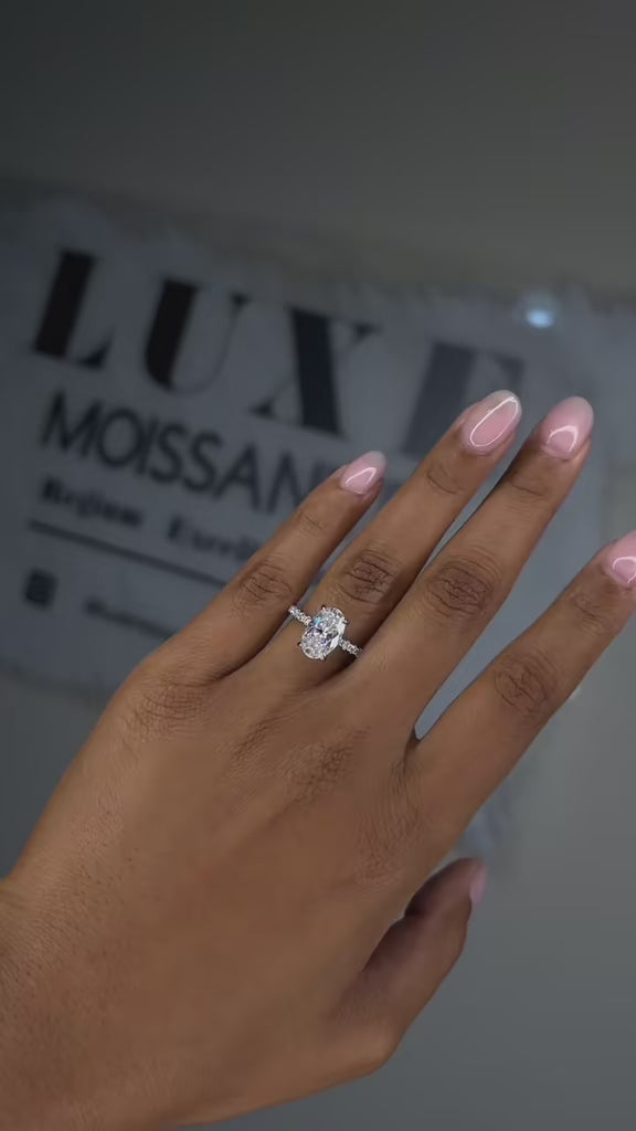 Tatiana is where timeless elegance meets modern brilliance. This striking piece showcases a dazzling 3.5-carat oval-cut moissanite in D colour, held in a graceful four-prong setting that maximises sparkle and light return. The band is adorned with a row of handset moissanite accents, offering a continuous shimmer that enhances the centre stone’s elongated silhouette. Crafted in solid 925 sterling silver and finished with rhodium plating, Tatiana blends luxurious refinement with everyday wearability.