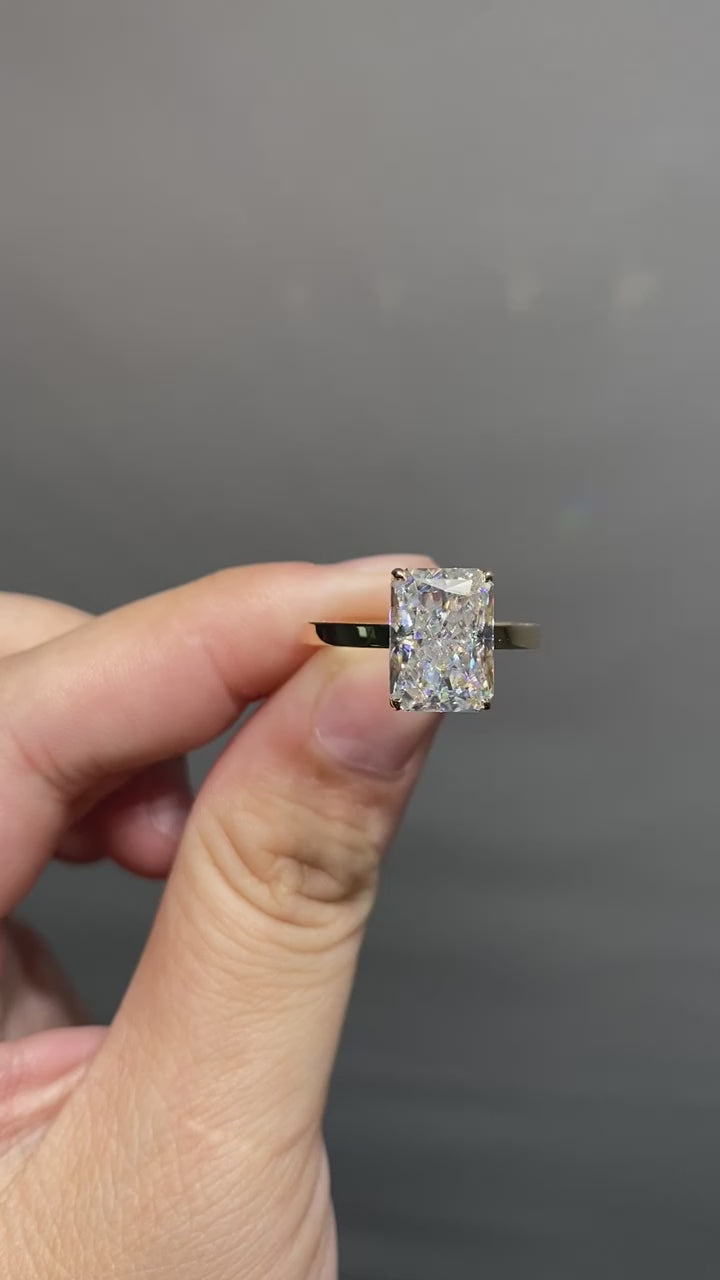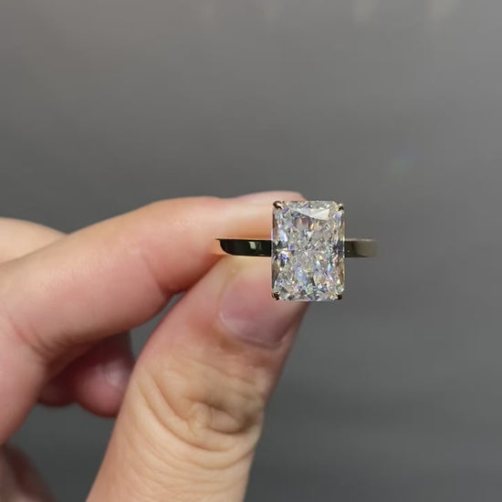 The Tina Ring is a striking interplay of contemporary refinement and enduring brilliance. Its centrepiece—a 4 carat crushed-ice hybrid radiant-cut moissanite—is expertly lifted in a classic prong setting, ensuring every facet catches the light to produce a dazzling display reminiscent of the world’s finest diamonds. The rectangular silhouette, with its crisp lines and generous surface area, radiates confidence and modern allure.